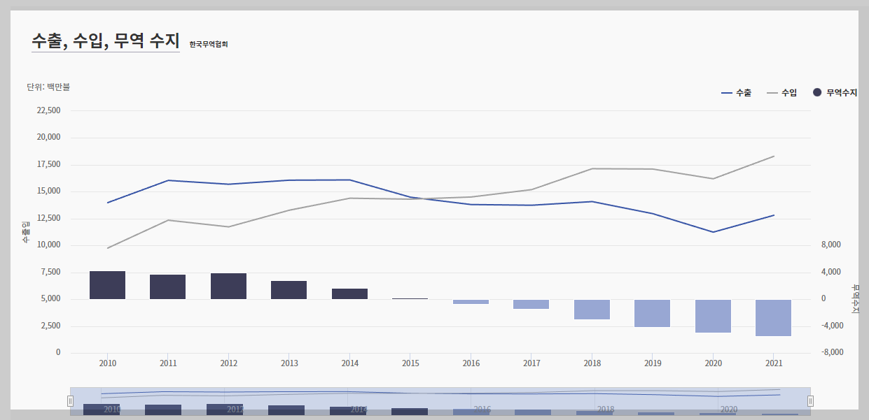 섬유패션산업은 2015년을 기점으로 수출보다 수입의 비중이 늘어나며 무역수지 적자를 기록하고 있습니다.