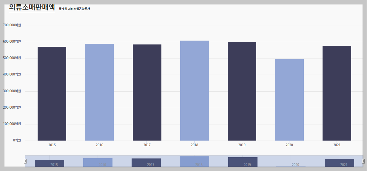 의류소매판매액은 2020년 코로나로 인해 판매액이 감소한 것을 제외하고는 큰 변동성없이 동일한 판매액을 기록하고 있습니다.