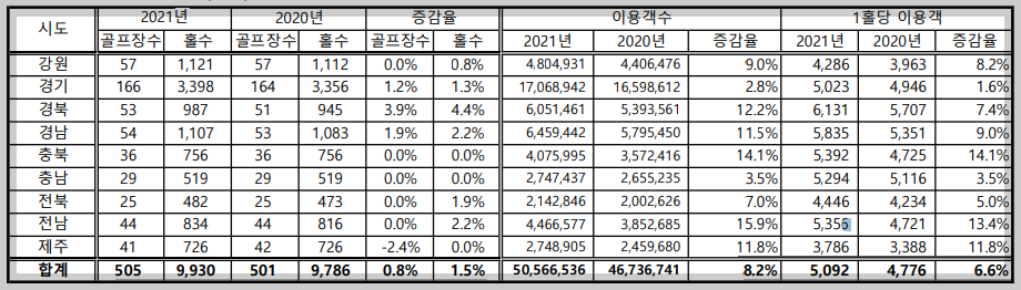 똑같은 골프장의 매출액을 비교했을 때, 지난해 대중골프장의 매출액 증가율은 21.2%, 회원제는 13.7%에 달했다. 이처럼 높은 매출액 증가율을 기록한 것은 골프장의 주된 수입원인 입장료ㆍ카트피가 코로나19 특수로 크게 올랐고 이용객수도 증가했기 때문이다.