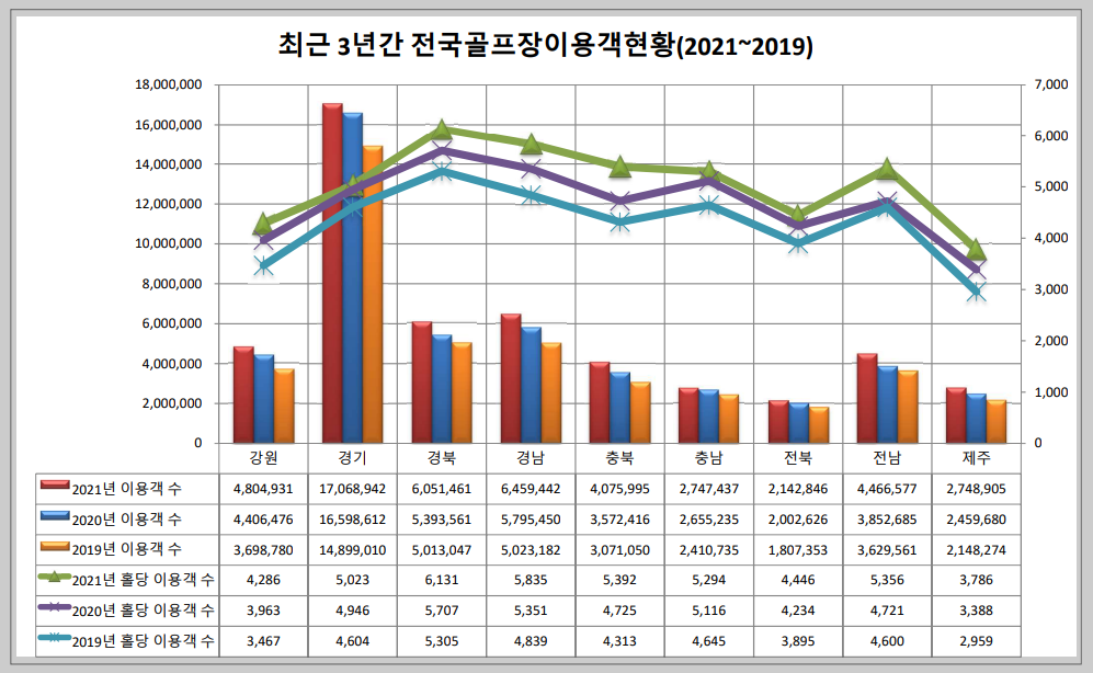 이는 코로나19 사태가 확산되면서 비교적 안전한 골프장의 이용횟수가 늘어나고 해외여행을 못나가는 20∼30대까지 골프장을 찾은 데다, 주 52시간 근무제․재택근무 확산 등으로 이용객수가 증가했고 골프장의 주된 수입원인 입장료ㆍ카트피도 크게 인상되었기 때문이라고 레저산업연구소 측은 분석했다.