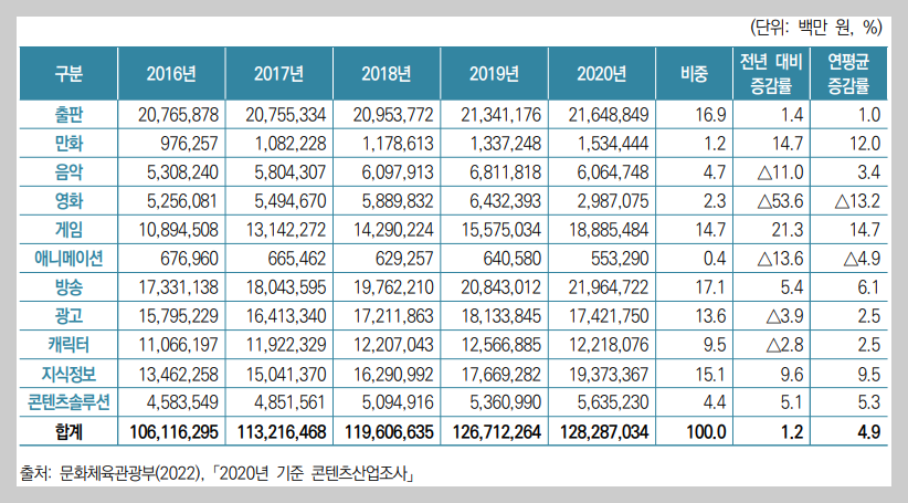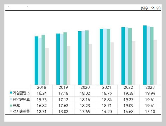 콘텐츠산업은 디지털기술의 발전에 따른 제작, 편집, 공유의 용이성으로 인해 디지털콘텐츠산업이 중심이 되었습니다. 이러한 변화와 더불어 IT인프라 개선으로 콘텐츠에 대한 접근성이 향상되었으며 PC에서 스마트폰까지 디지털콘텐츠를 소비할 수 있는 스마트기기가 다양화, 경량화, 이동 편의성을 보유하게 됨에 따라 소비자의 디지털콘텐츠 소비가 확대되었습니다. 이에 콘텐츠 산업의 디지털 전환 가속화로 VR/AR, AI 등 신기술과 결합된 융합콘텐츠가 확산됨에 따라 디지털콘텐츠는 전방위 산업에서 영향력을 높이며 글로벌 경제 내 핵심 산업으로 성장하고 있습니다.