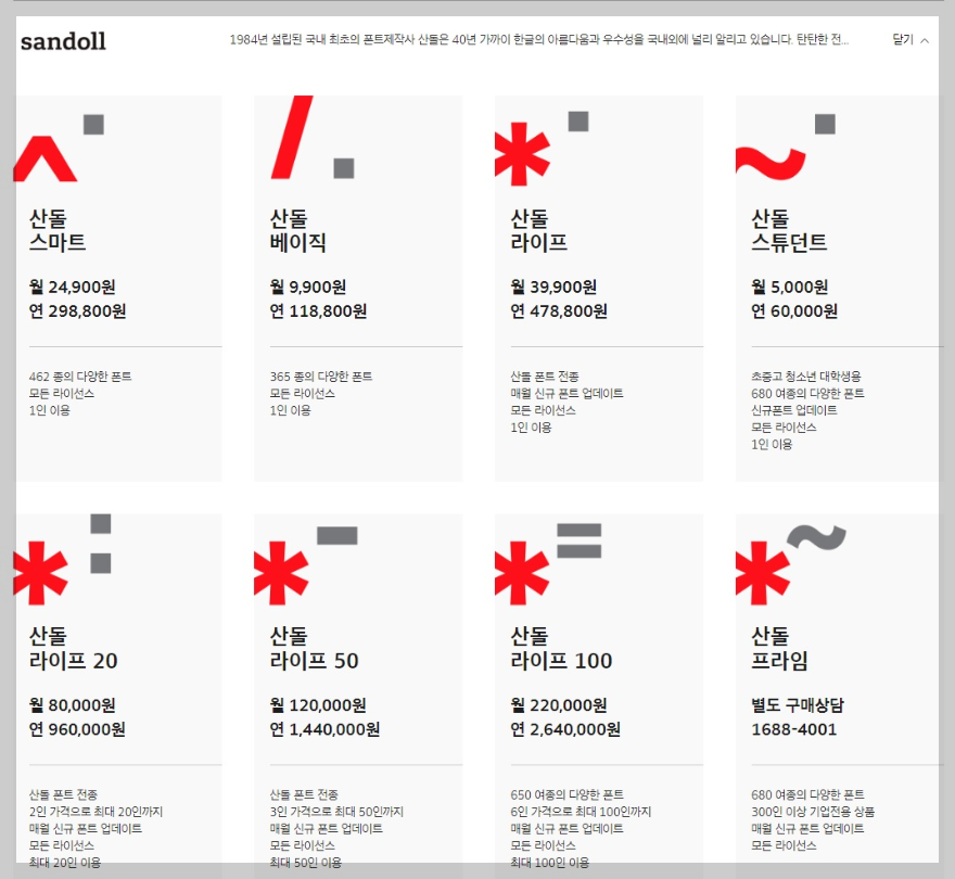 산돌은 제공하는 폰트의 수에 따른 기준 외에, 최대 이용가능한 인원수에 따라 가격을 달리하는 상품을 출시하여 1인, 20인, 50인, 100인 단위로 차별화된 요금제를 운영하고 있습니다. 이를 통해, 기업의 종업원 규모에 최적화된 상품으로 기업고객을 유치하고 있습니다.