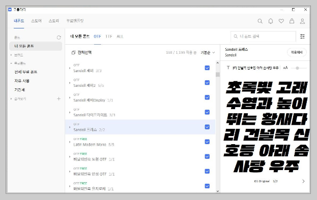 또한, 게스트 로그인 기능을 신설해 무료폰트만 사용하는 유저는 회원가입이나 로그인 없이 어플리케이션의 다운로드만으로 자유롭게 무료폰트를 이용할 수 있습니다. 산돌구름을 통해 그간 폰트 사용자들이 무료폰트를 사용하기 위해 겪어야 했던 소송 걱정과 불편함들을 해결하였습니다.