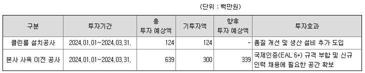 아이씨티케이는 고객사의 요구 수량에 따라 반도체 외주 생산을 하고 있는 팹리스 회사이므로 생산설비를 보유하고 있지 않으며, 조립 제품 생산 또는 외주 생산을 하고 있으므로 조립 생산 설비를 보유하고 있지 않습니다. 다만, 고객사 최종 공급 전에 최종 검수 장비 및 고객사 별로 요청 받은 인증서 주입 및 Provisioning 단계에 필요한 장비를 보유하고 있습니다.