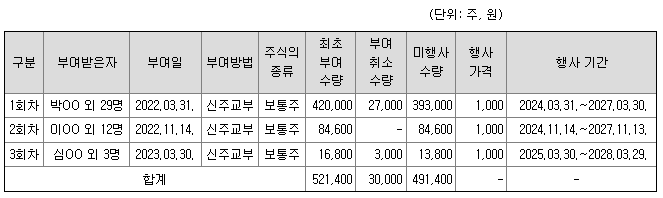 현재 주식매수선택권 부여 내역은 아래와 같으며 미행사 주식매수선택권은 증권신고서 작성일 3.21일 현재 491,400주로, 이는 공모 후 발행주식총수의 3.74%입니다. 향후 주식매수선택권의 행사로 인하여 신주가 발행되어 시장에 출회될 경우 아이씨티케이의 상장 후 주가에 희석화 요인으로 작용하여 주가에 부정적인 영향을 미칠 수 있습니다. 투자자께서는 상기와 같이 출회 가능한 물량에 대해 반드시 유의하시기 바랍니다.