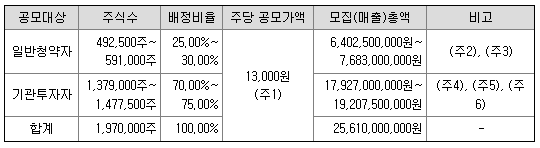 - 모집(매출)가액 모집(매출)총액 인수금액 및 인수대가는 대표주관회사와 발행회사가 협의하여 제시한 희망공모가액인 13,000원 ~ 16,000원 중 최저가액인 13,000원 기준입니다. 참고목적으로 희망공모가액 최고가인 16,000원 기준 금번 공모의 모집(매출)총액은 31,520,000,000원입니다.