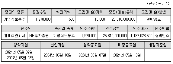 - 수요예측 안내공고는 2024년 04월 24일 대표주관회사인 NH투자증권㈜의 홈페이지(https://www.nhqv.com)에 게시함으로써 개별 통지에 갈음합니다.