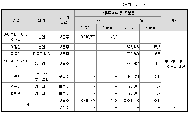 금번 공모예정주식 및 상장주선인의 의무인수분을 포함한 아이씨티케이의 상장예정주식수(보통주) 13,133,596주 중 최대주주인 이정원 대표이사가 보유한 1,675,428주(상장예정주식수 기준 지분율 12.76%)의 의무보유 기간은 「코스닥시장 상장규정」 제26조 제1항 제1호에 따르면 상장일로부터 1년이나,상장 이후 안정적인 경영 및 투자자 보호 조치 차원에서 자발적으로 의무보유 기간을 2년 추가하여 상장일로부터 3년간 한국예탁결제원에 의무보유합니다.