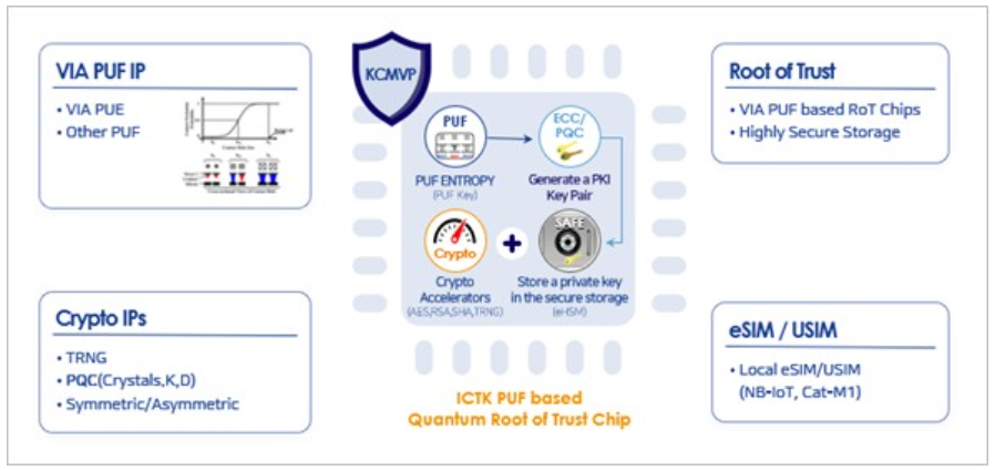 아이씨티케이의 VIA PUF 기술은 기존의 능동소자를 기반으로 하는 PUF 기술들이 가지고 있는 항상성 문제를 오류정정코드(ECC, Error Correction Code) 없이 근본적으로 해결한 기술입니다. 또한 아이씨티케이는 VIA PUF 기술 외에도 IoT 간 안전한 인증과 데이터 보호의 근간이 되는 신뢰점(RoT)를 제공하는 보안기술을 보유하고 있으며, 이를 기반으로 보안칩을 설계하여 공급하고 있습니다. 나아가 아이씨티케이는 보안칩을 활영한 보안 모듈, 보안 디바이스, 보안 플랫폼 및 솔루션을 공급하고 있습니다.